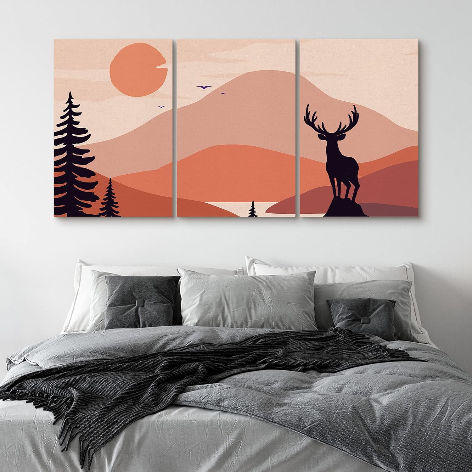 IDEA4WALL Canvas Print Wall Art Set Deer Above Orange Mountain Peak Animals Wilderness Illustrations Modern Art Southwest Scenic Relax Calm Multicolor Warm for Living Room Bedroom Office x3