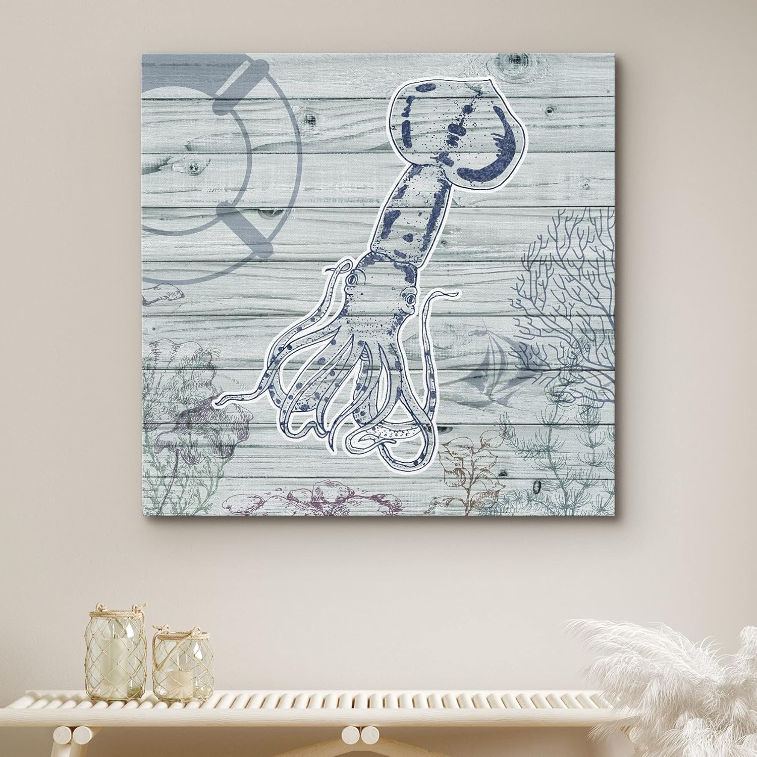 IDEA4WALL Canvas Print Wall Art Squid Swims in Ocean Animals Beach Digital Art Modern Art Nautical Relax/Calm Blue Duotone for Living Room, Bedroom, Office - 12"x12"