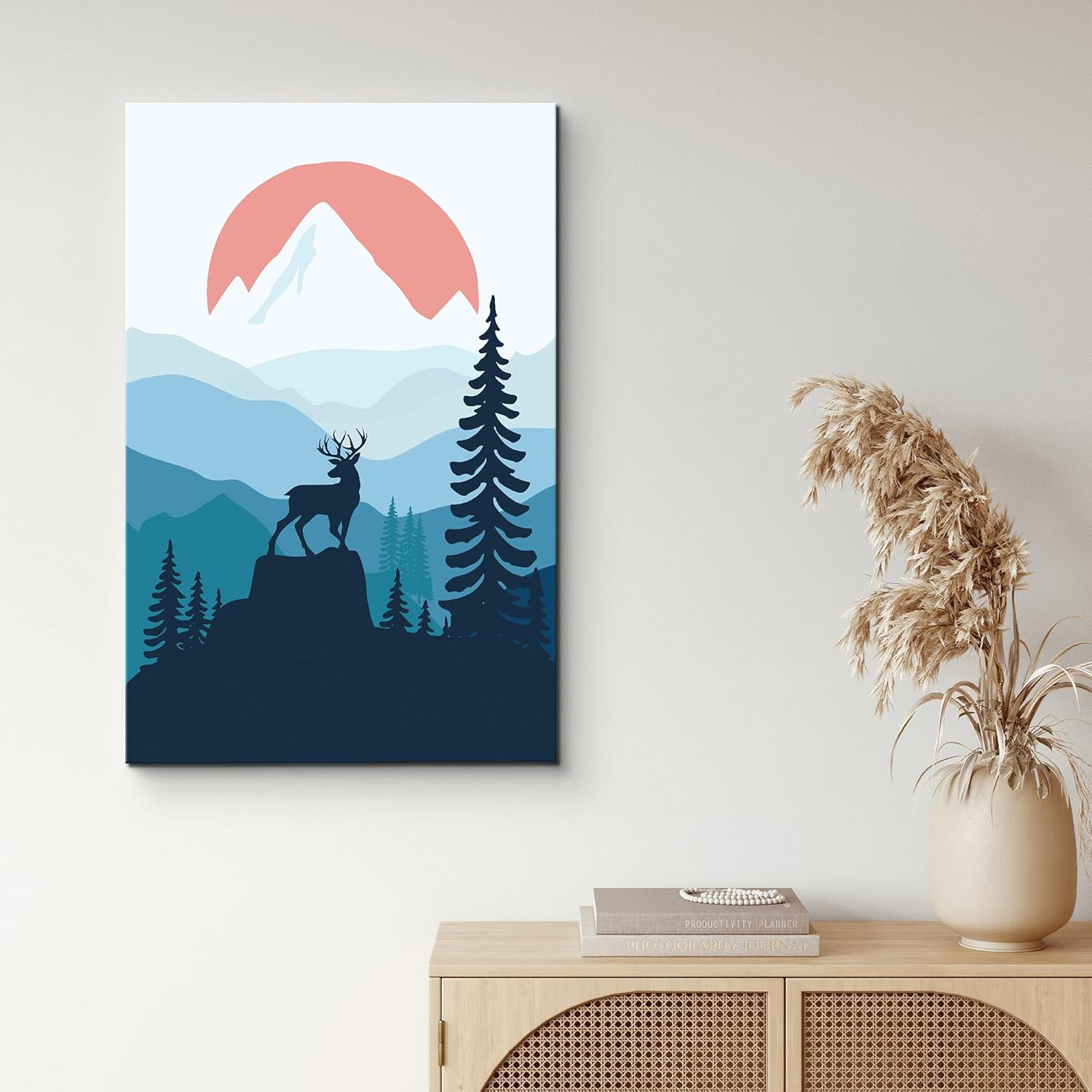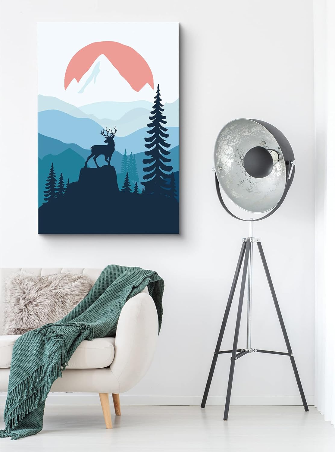 IDEA4WALL Canvas Wall Art Deer with White Teal Snowy Mountain Red Sun and Navy Blue Pine Forest Nature Wilderness Illustrations Minimalism Modern Scenic for Living Room Bedroom Office inches