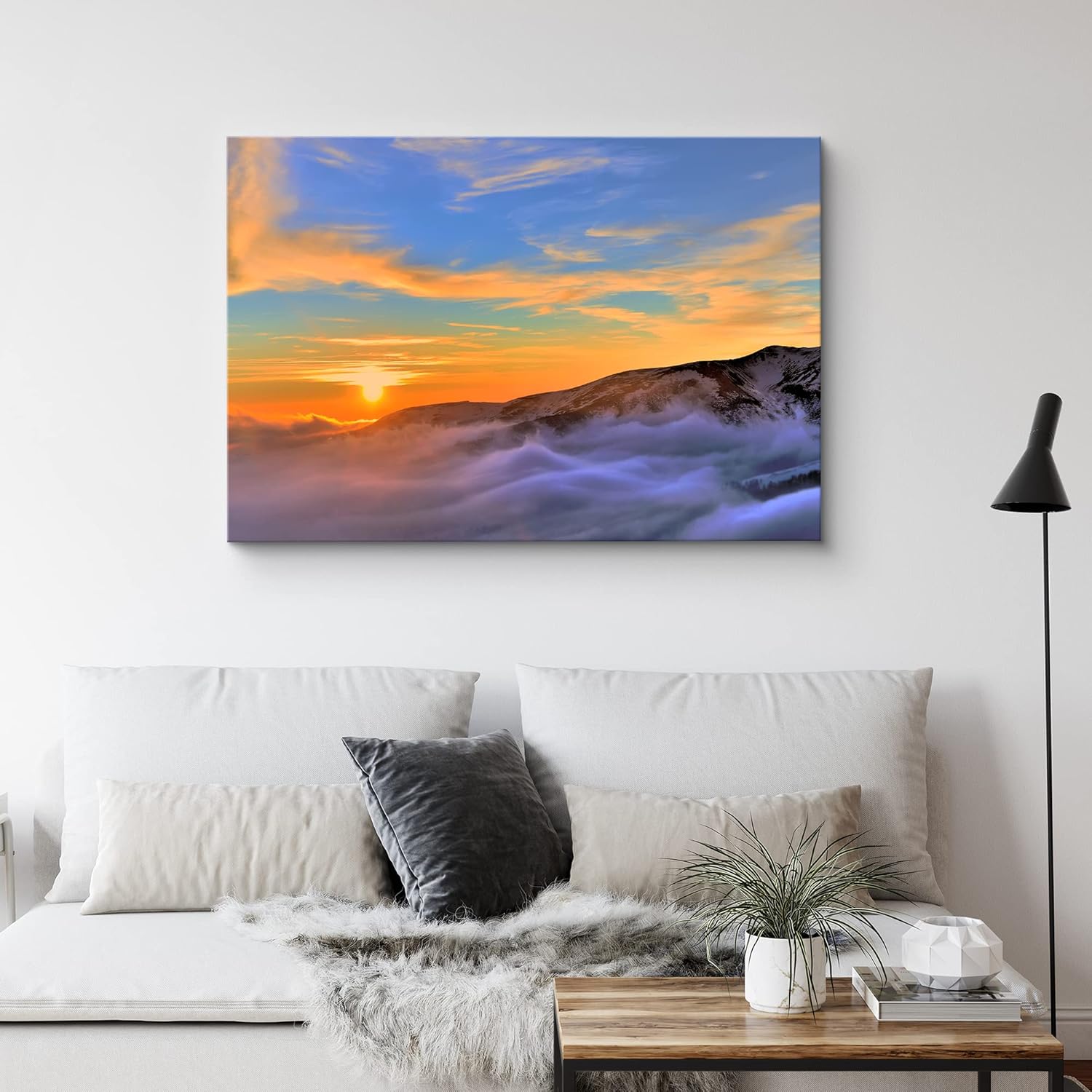 IDEA4WALL Canvas Wall Art Orange Blue Sunset Over Yellow Skyline Foggy Mountain and Valley Landscape Wilderness Photography Realism Traditional Scenic for Living Room Bedroom Office