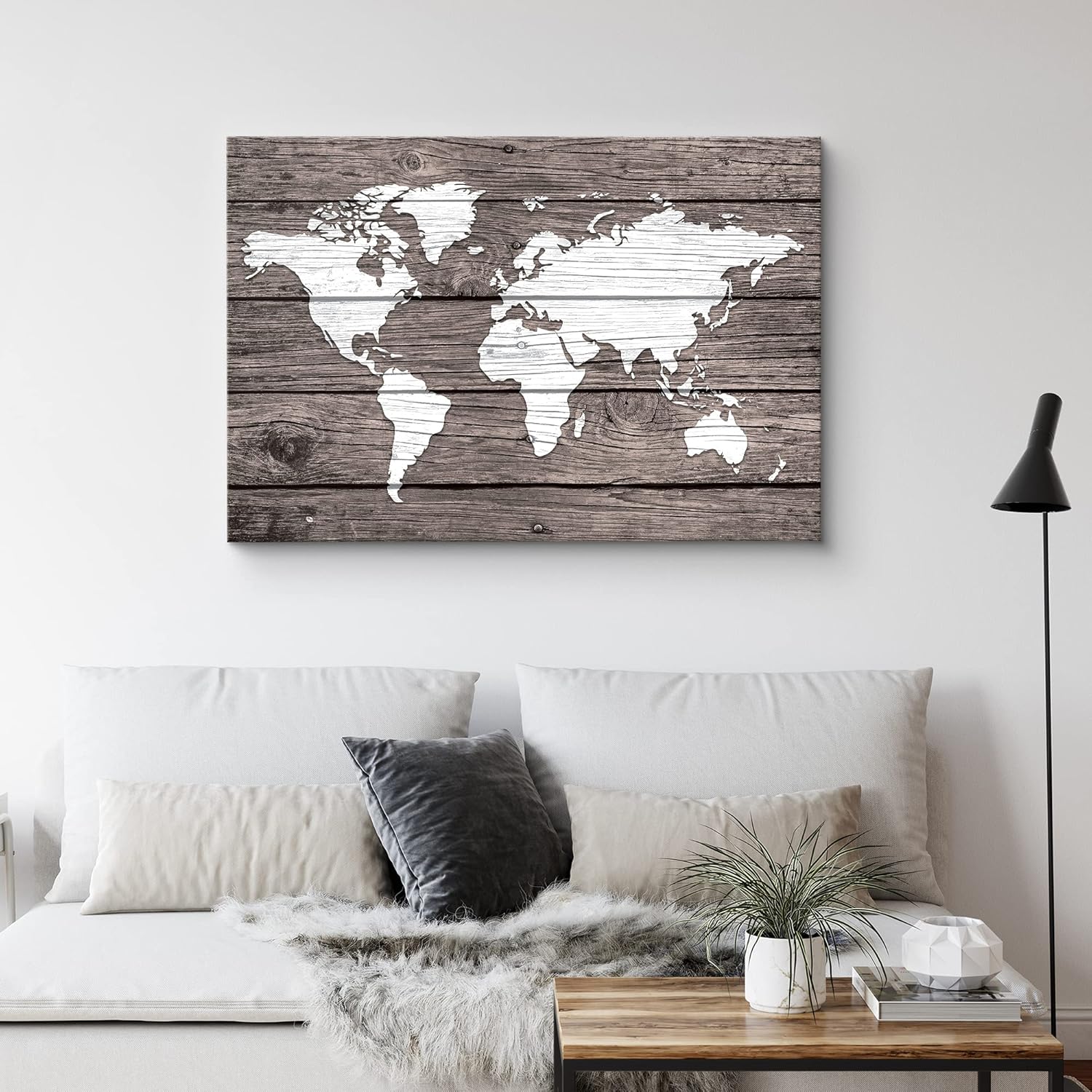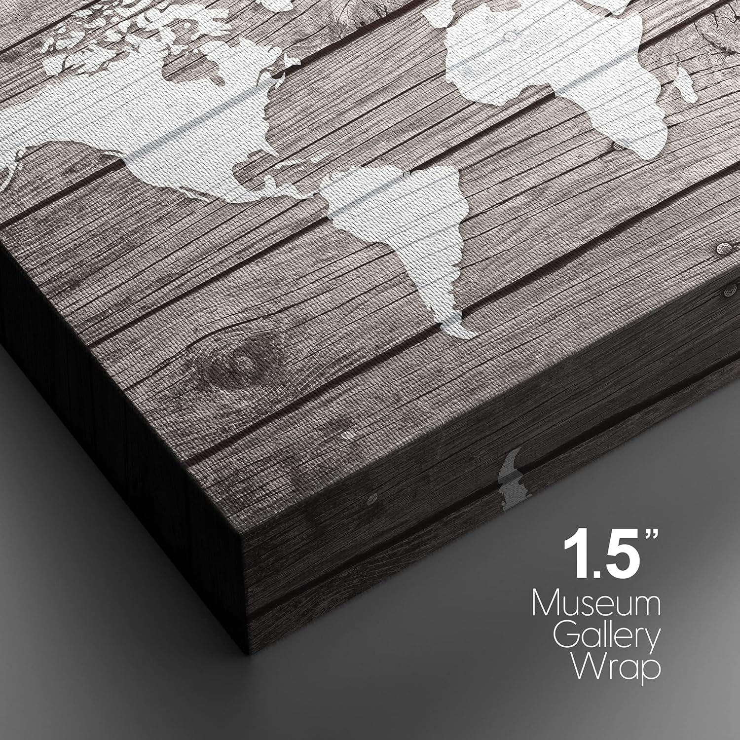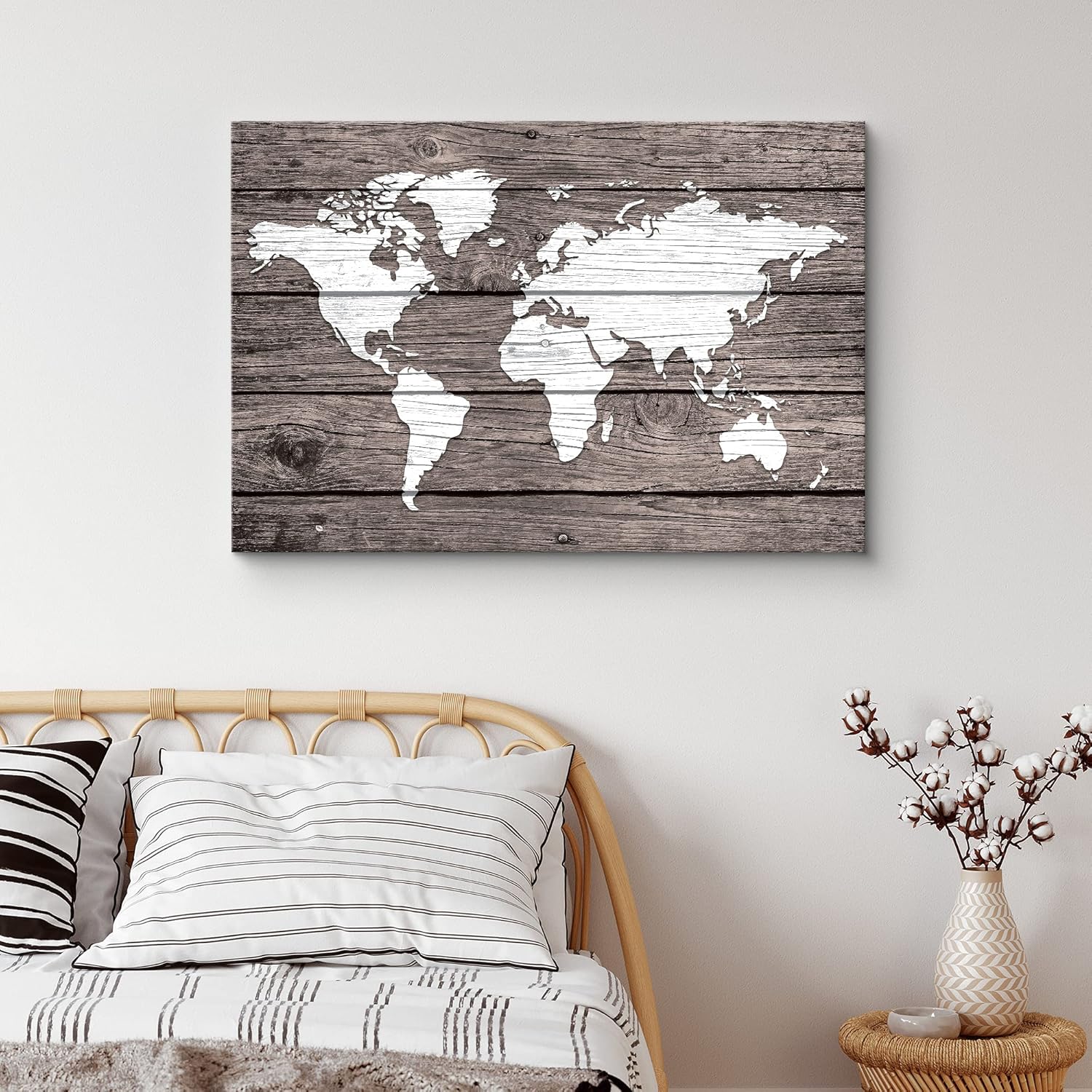 IDEA4WALL Canvas Wall Art White World Atlas Map on Dark Brown Wood Panel Places Country Mixed Media Realism Global Urban for Living Room, Bedroom, Office - 24"x36"